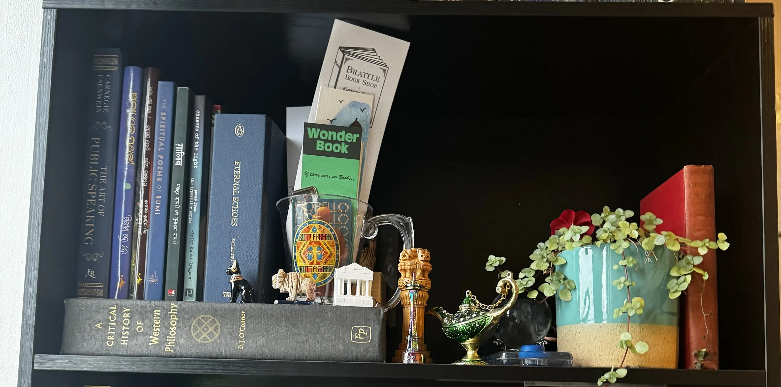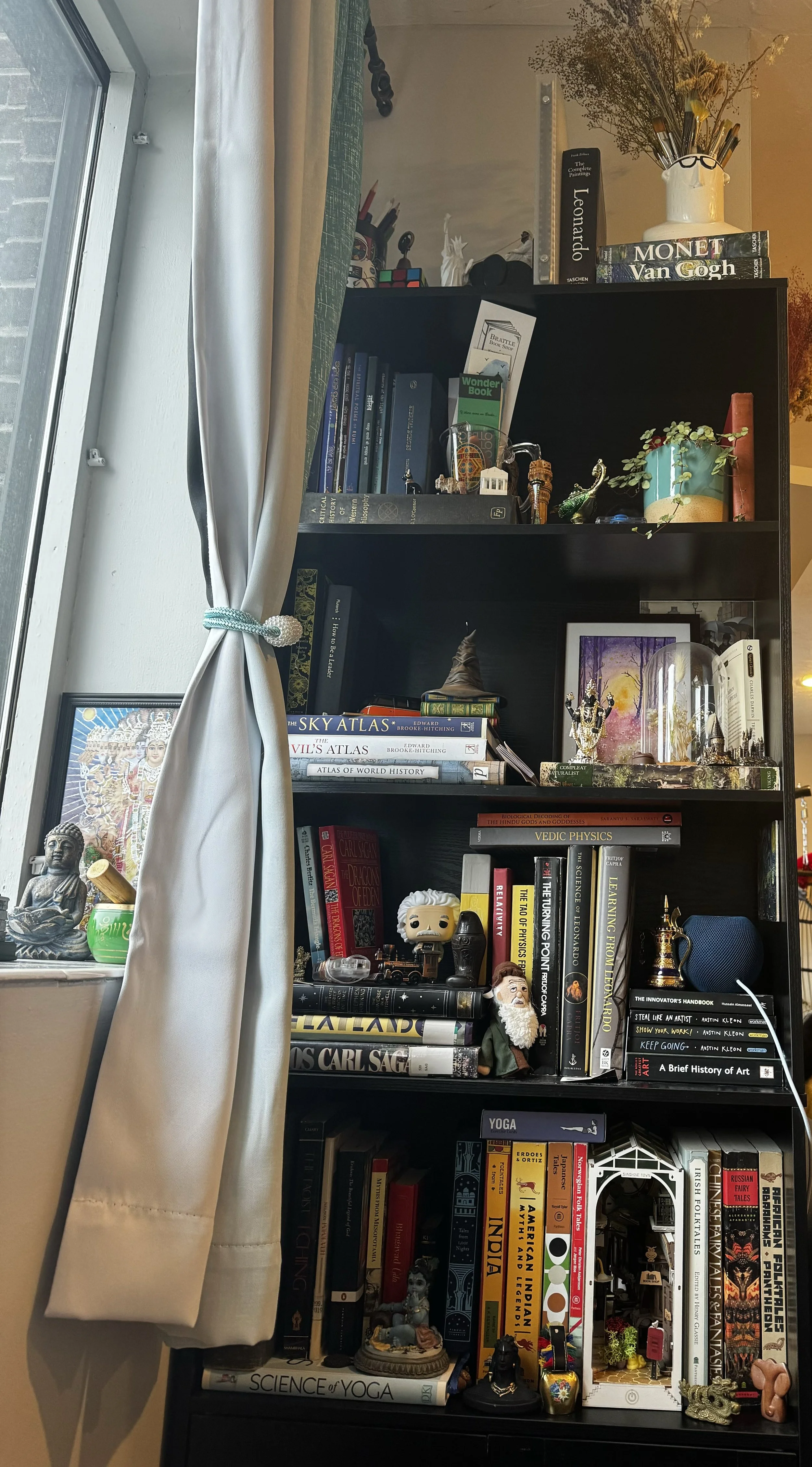 Nestled within the walls of my home in Boston, my current bookshelf stands as a testament to a lifelong commitment to the written word. This carefully curated collection reflects not just a chronicle of diverse genres and literary epochs but a tangible representation of my intellectual and aesthetic evolution. From deep contemplating fiction to the profound insights of scientific visionaries, the shelves hold the imprints of Rowling, Sagan, and more. The synergy of art and intellect unfolds as Van Gogh's strokes converse with the eloquence of Carl Sagan's cosmos. It's a sanctuary where theology from across continents finds common ground, and the verses of Dickinson and Frost resonate with the hallowed silence of a reading nook, creating a haven that transcends physical space, inviting the mind to wander and explore the boundless landscapes of imagination and knowledge.