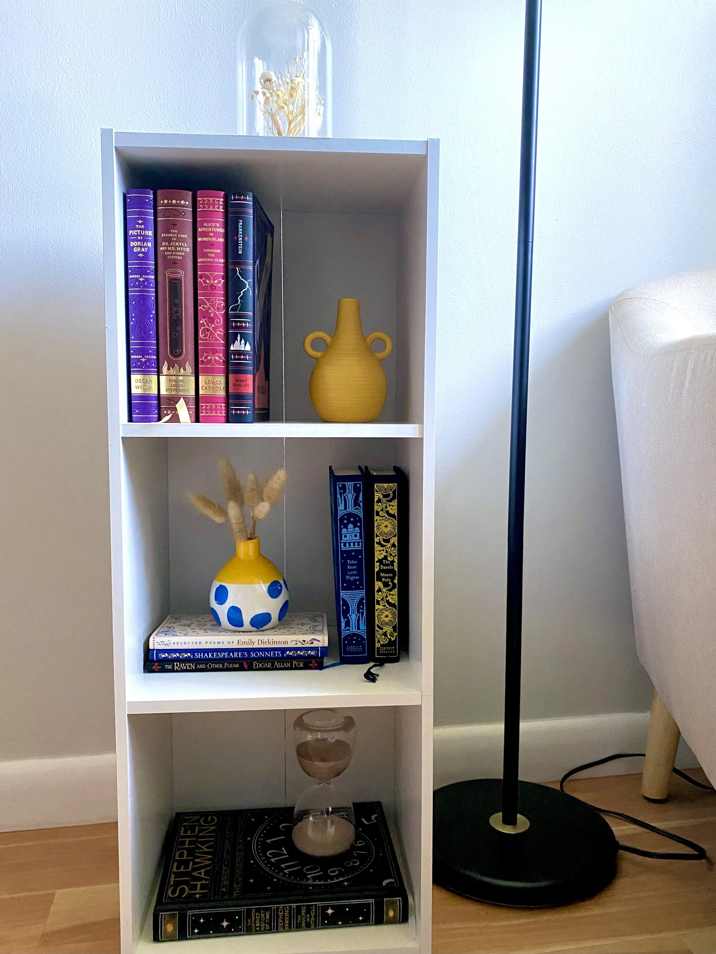 The smaller side bookshelf, adorned with an artistic flair, unfolds as a curated showcase of literary exclusivity. Each volume, a testament to its uniqueness, bears the imprint of prestigious editions from Barnes and Noble, standing as tangible treasures within the collection. The limited and exclusive editions, with their ornate covers and finely crafted bindings, become not only gateways to literary realms but also aesthetic focal points. The integration of small vases alongside these literary gems adds a symphony of colors, creating a visual harmony that complements the tactile beauty of the books. This meticulous curation transforms the side bookshelf into a miniature gallery, where each piece, whether a book or a vase, contributes to a narrative of refined taste and artistic appreciation, inviting both the mind and the senses to revel in the pleasures of literature and visual elegance.