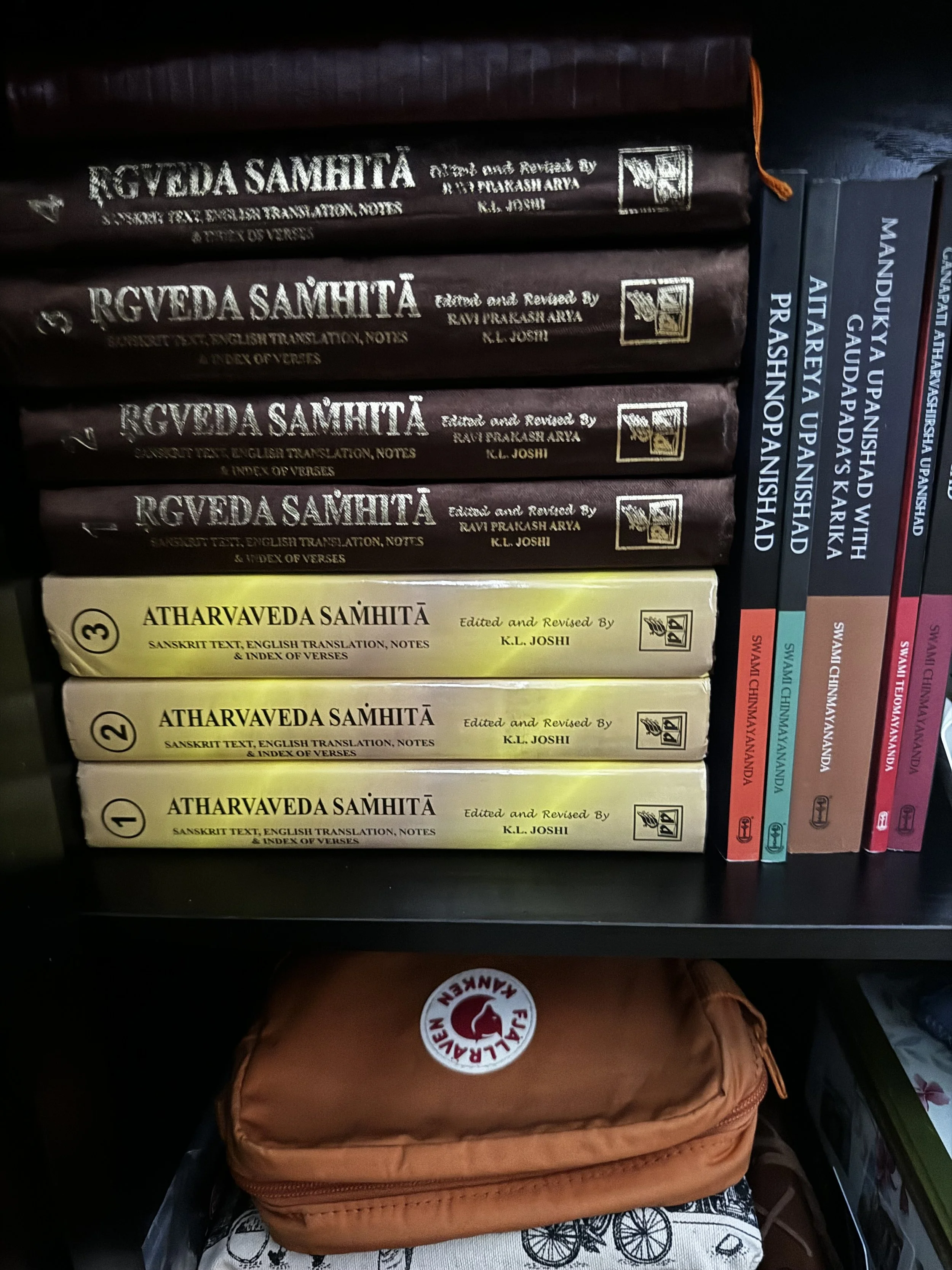 In the concealed sanctuary of the cupboard within the bottom half of my bookshelf, a profound journey into my cultural roots unfolds through the sacred texts of the Vedas and Upanishads. As an Indian, this collection holds a special significance, providing a gateway to the ancient philosophies and spiritual wisdom that form the bedrock of my cultural heritage. The Vedas, with their hymns and rituals, and the Upanishads, delving into profound metaphysical inquiries, offer a deep well of insights into the essence of Hindu philosophy. Within the pages of these revered texts, I explore the intricate tapestry of my own cultural identity, gaining a nuanced understanding of the timeless principles that have shaped the collective consciousness of generations. This collection serves not only as a repository of wisdom but also as a connection to the spiritual lineage that has endured for centuries.
