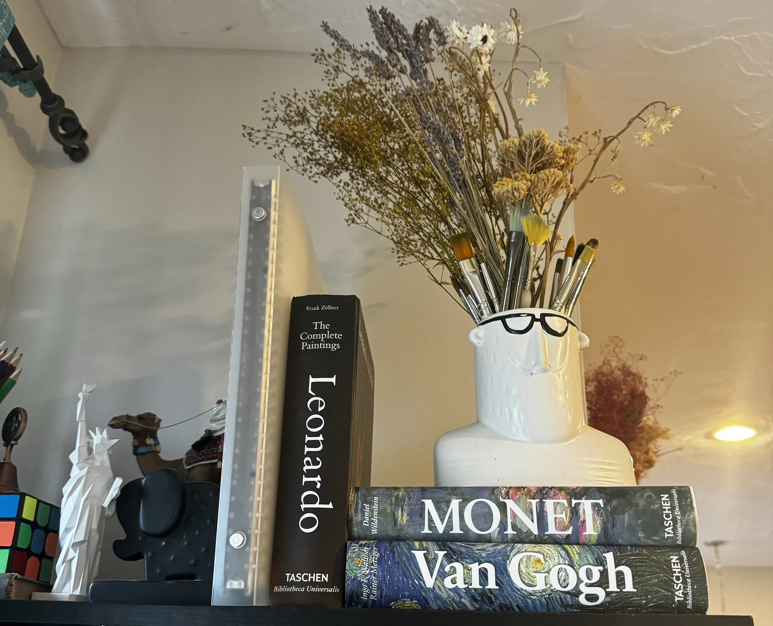 Crowning the pinnacle of my bookshelf is a cherished collection that transcends literature and transcends into the realm of visual art – the repository of my art books. This zenith holds the profound works of masters whose canvases have left an indelible mark on the history of art. The vibrant strokes of Van Gogh, where color and emotion dance in unison, find a place of honor alongside the dreamy landscapes of Monet, where light and atmosphere converge in poetic harmony. The pages also unfold the genius of Leonardo Da Vinci, whose notebooks reveal the intricate workings of a mind that effortlessly traversed the boundaries between art and science. Each art book within this celestial summit is a portal to a world where creativity knows no bounds, and where the visual language of these maestros speaks to the core of human expression. This collection serves as a perpetual source of inspiration, inviting me to revisit the profound beauty captured by Van Gogh's Starry Night, the serene lily ponds painted by Monet, and the visionary sketches of Da Vinci, creating a sanctuary where the artistry of words meets the visual poetry of these timeless masters.