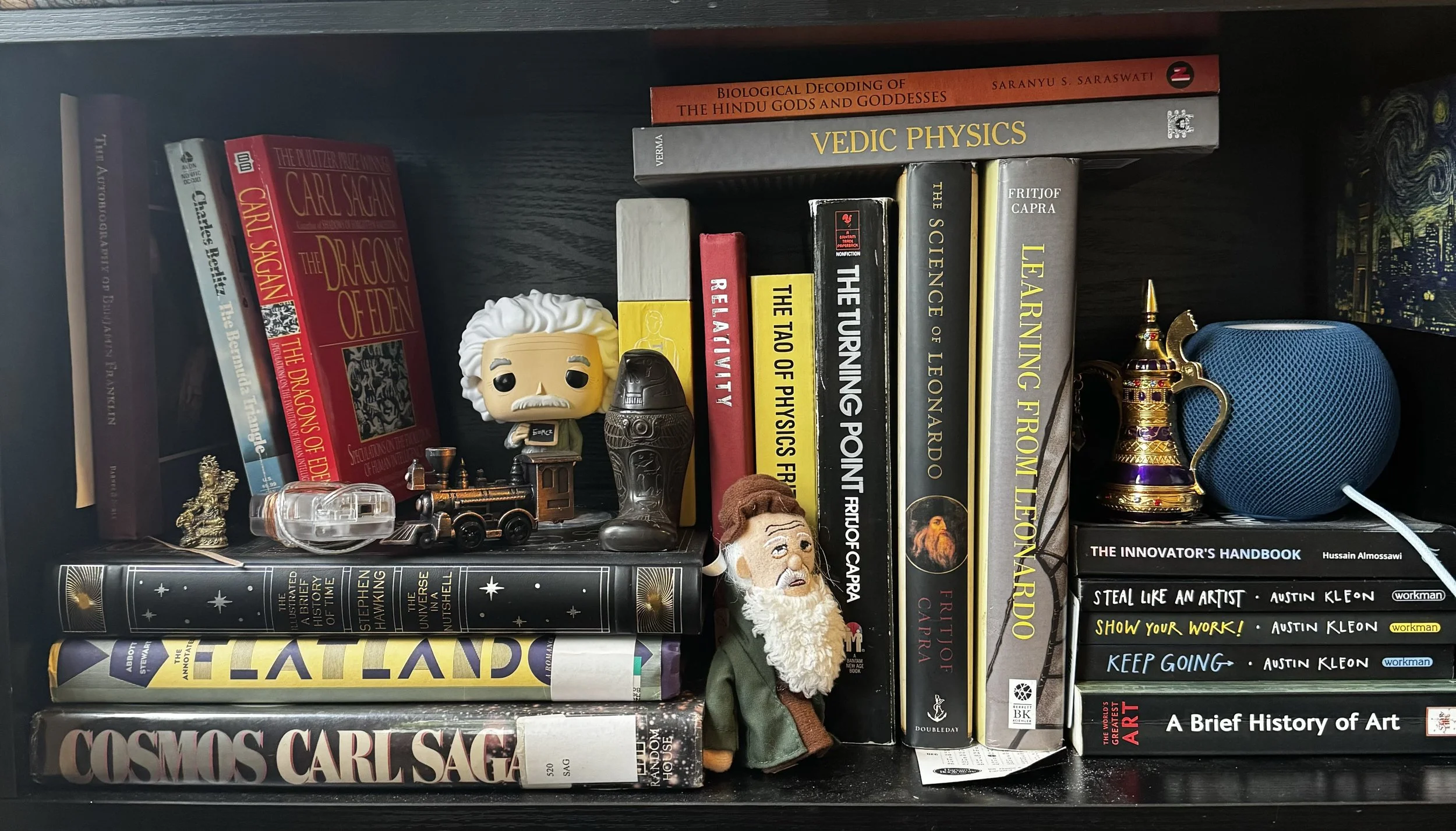 Ascending to the science row on my bookshelf is a convergence of intellectual exploration and scientific wonder. Here, the groundbreaking theories of Einstein, encapsulated in his work on relativity, share space with the cosmic musings of Carl Sagan and the transformative insights of Fritjof Capra, notably his seminal work, "The Tao of Physics." This particular book serves as a bridge between the realms of modern science and ancient mysticism, exploring the parallels that exist between the scientific understanding of the universe and the profound insights of Eastern philosophies. The collection extends to the notebooks of Leonardo Da Vinci, a polymath whose insatiable curiosity and relentless pursuit of knowledge serve as a beacon in my own quest for continuous learning. Da Vinci's sketches and writings provide a tangible link to a mind that transcended disciplinary boundaries, inspiring a holistic approach to understanding the mysteries of the universe, whether through the lens of physics, astronomy, or the intersection of science and spirituality.